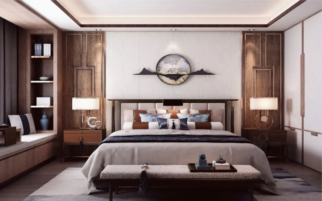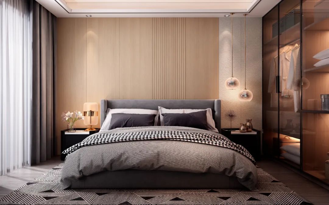 暖色的墻面,柜體。可以搭配一些淺色的床上用品,做一些點綴。然后搭配一些暖色調的燈光,整個空間看起來更加溫暖。