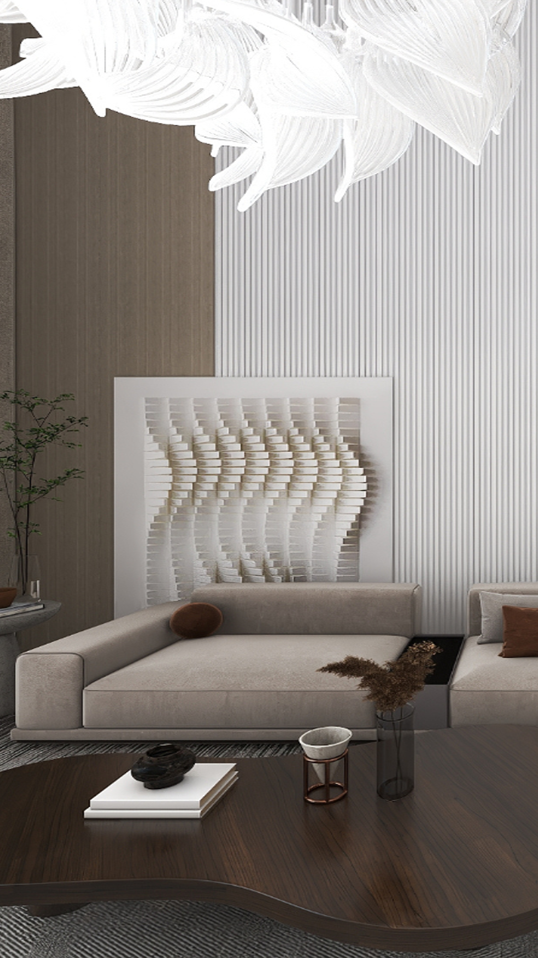 客廳沙發背景墻使用環保水性科技木紋搭配高級的5D潘多拉石紋打印畫,結合白布藝布紋格柵,質感爆棚。