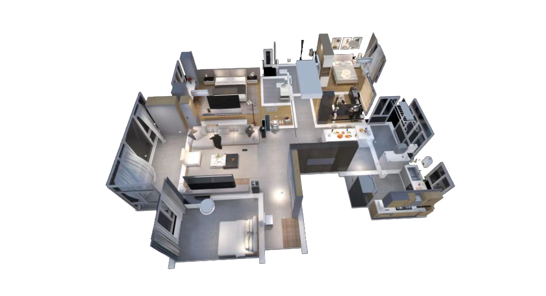 客餐廳一體設計,沙發背景墻,大面積通鋪科技木及同色配套格柵就可以輕松打造!!基材選用星優木板竹木纖維集成墻板,厚度為9mm,免打底,易安裝,縮短工期。