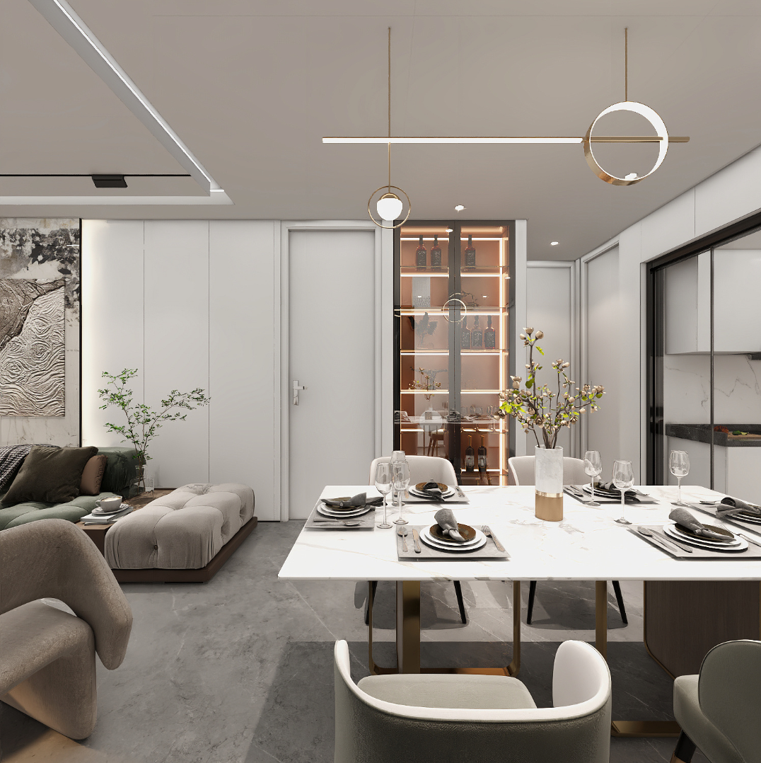 在絲絨布紋白的主色中點綴以墨綠為主的綠色調,白中綴綠的設計風格給人一種深沉而舒適的感覺,搭配簡約的燈光效果更是別有一番韻味!