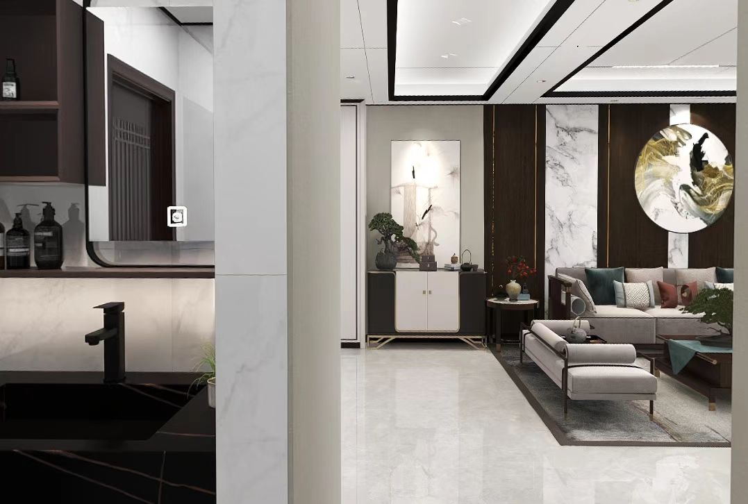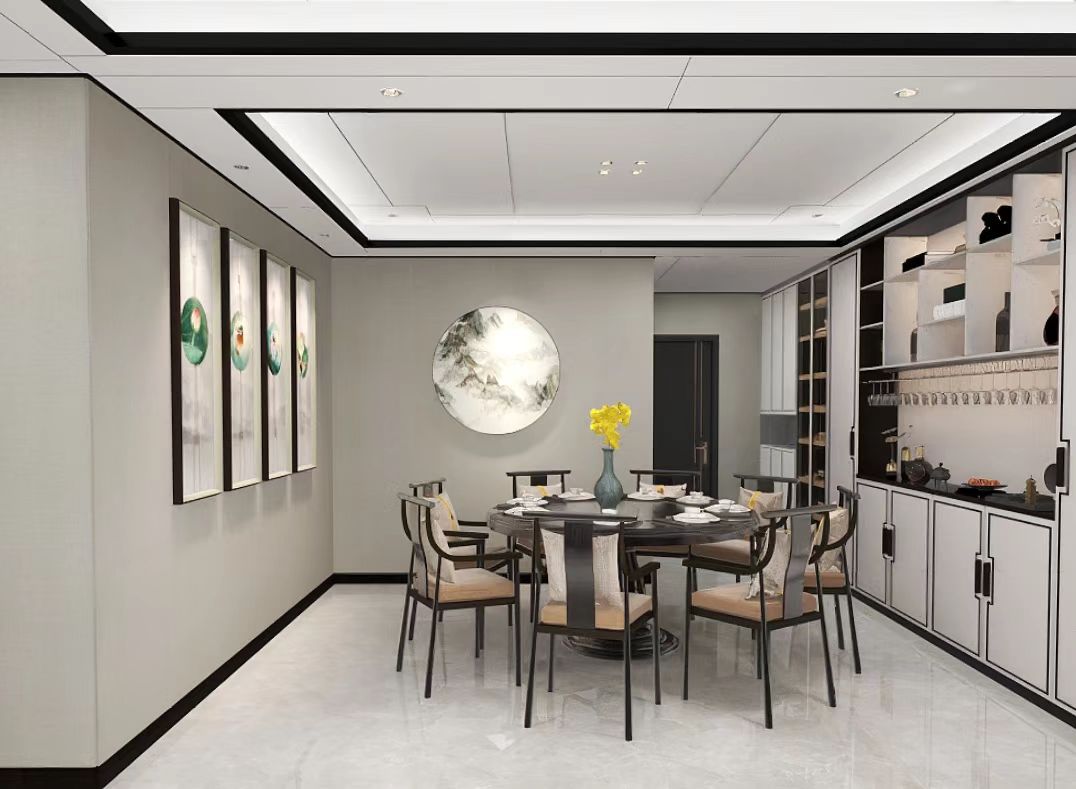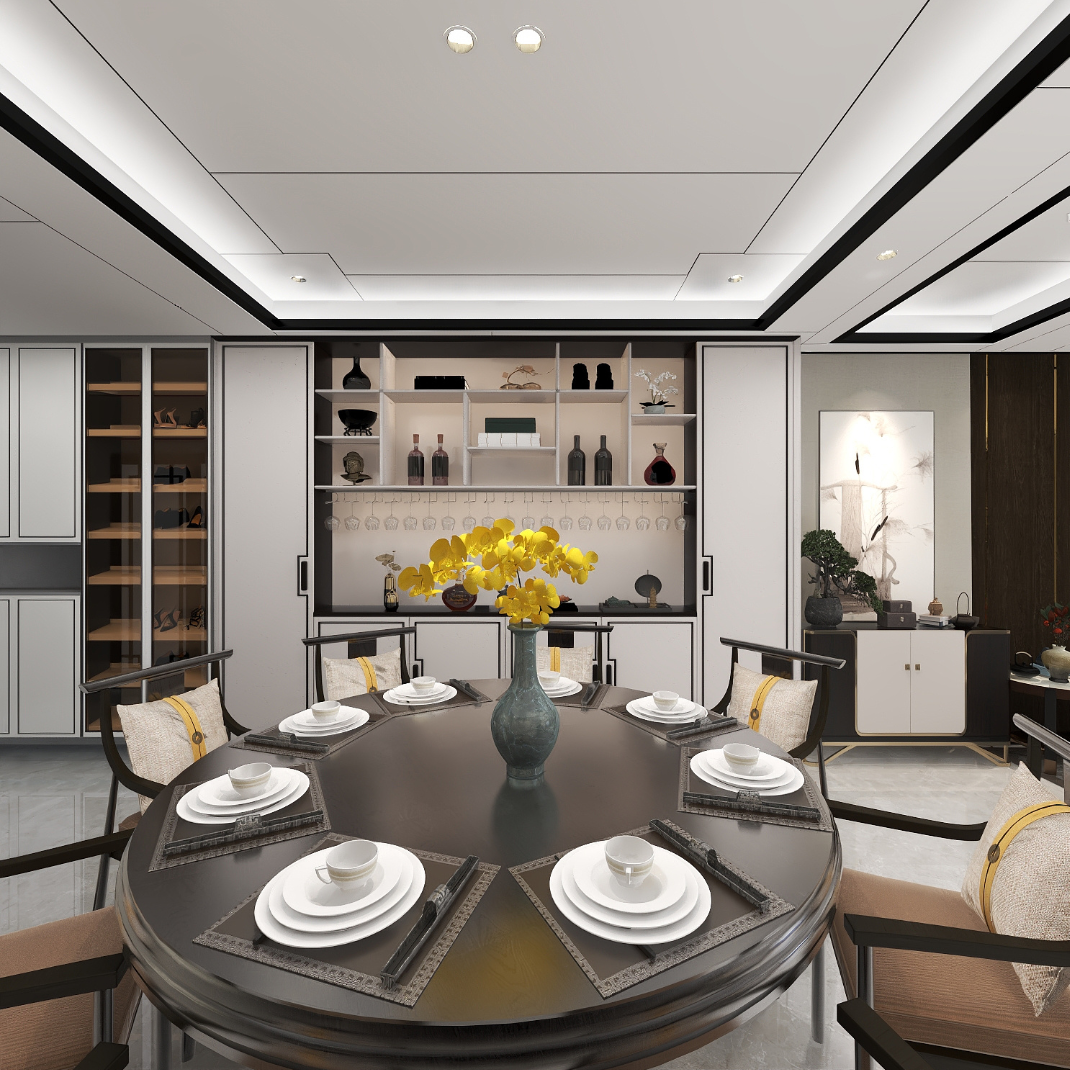 新中式調和溫潤典雅的視覺氛圍,全屋采用暖色系光感,深色木紋沉穩細膩且溫潤醇厚沁潤著秋日的優雅與深邃
