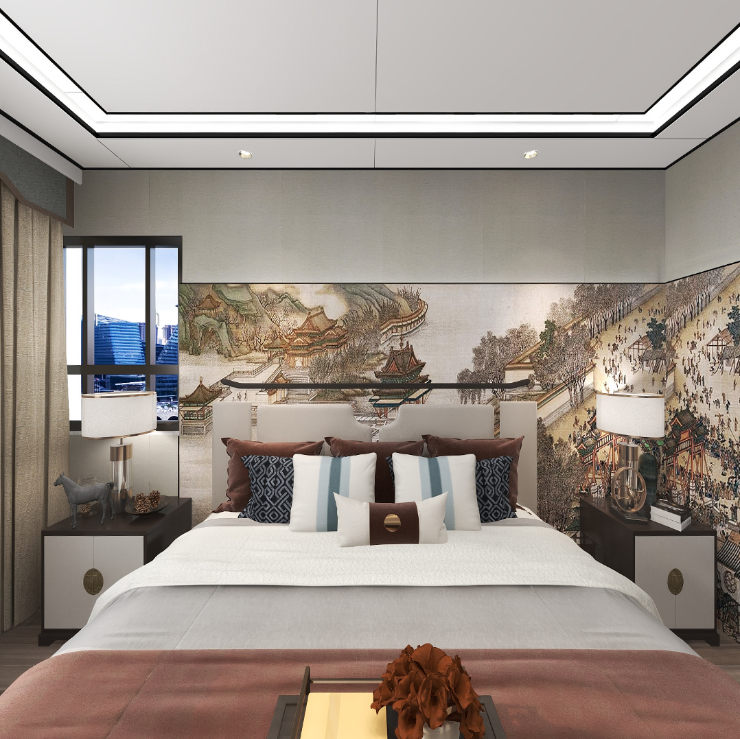 淺色的美拉德風格,以巨幅5D中式水墨畫為主色調,搭配灰色調冷布藝,一明一暗,仿佛高山流水,渾然天成。