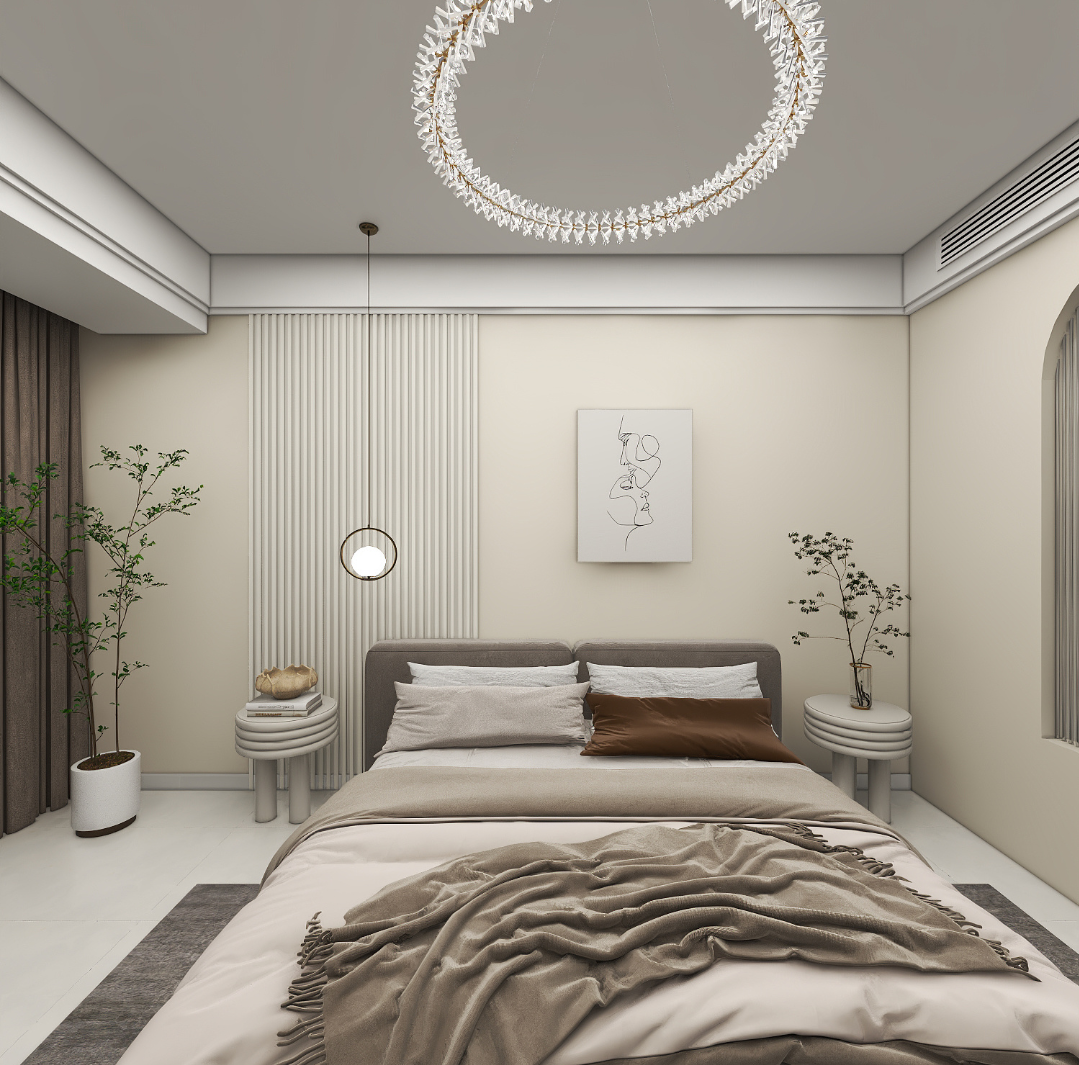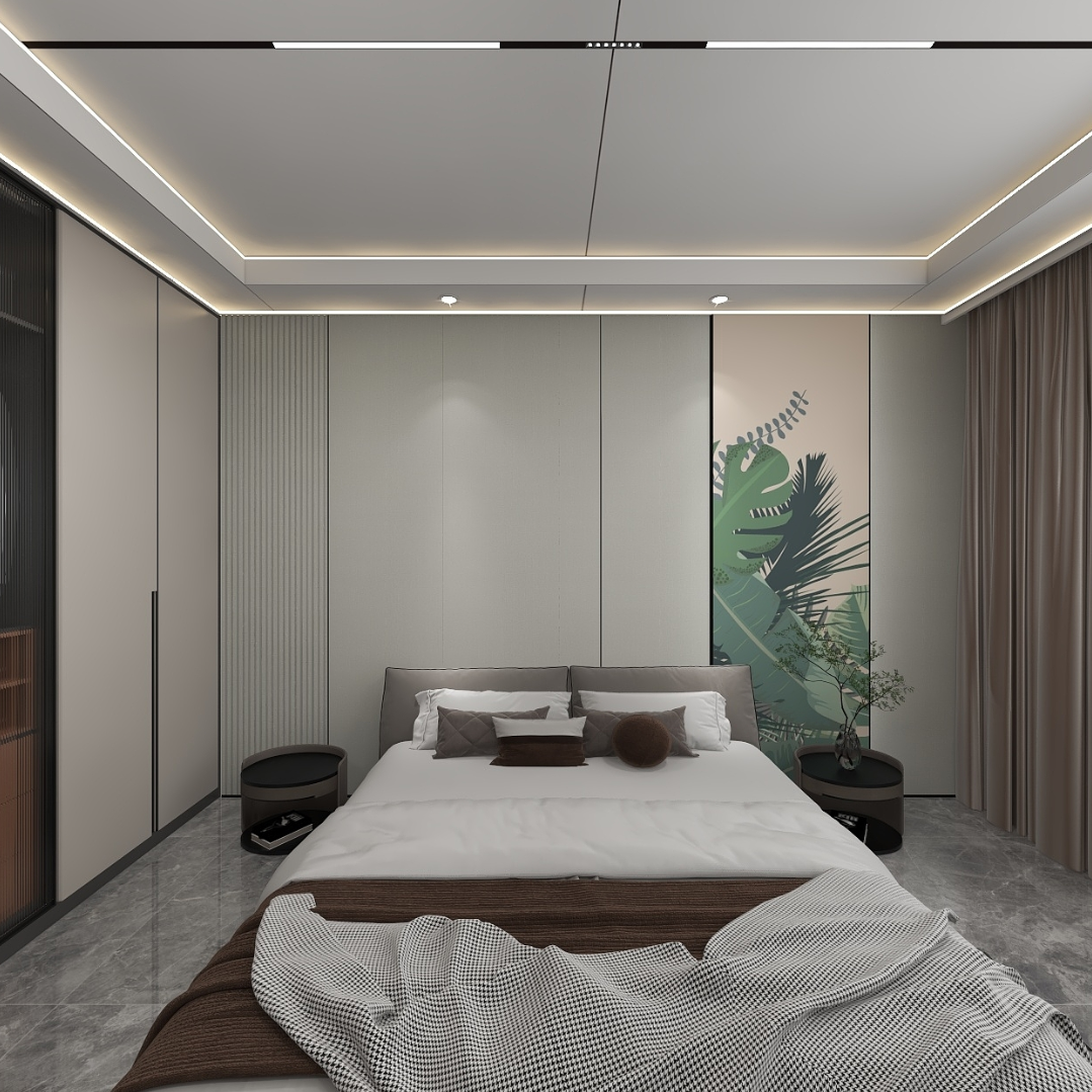這款臥室背景墻設計獨具匠心,整體采用低飽和度的莫蘭迪色系中的淺灰布紋集成墻板為基調,搭配在一整片磨砂白墻板上打印的ins風3D綠植打印畫,輕奢優雅的氛圍感撲面而來。