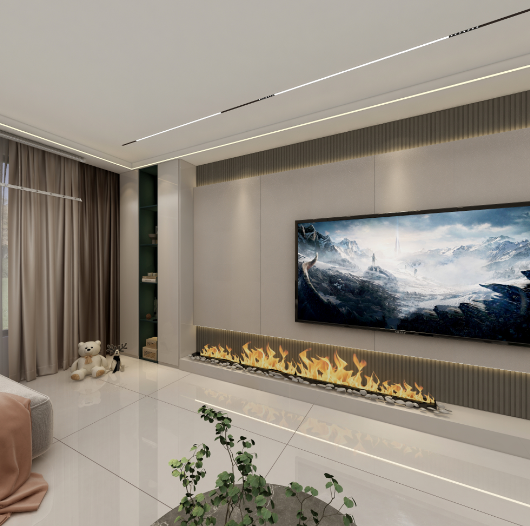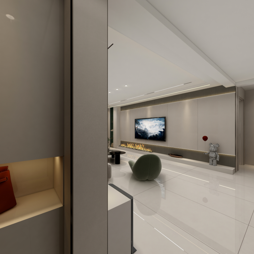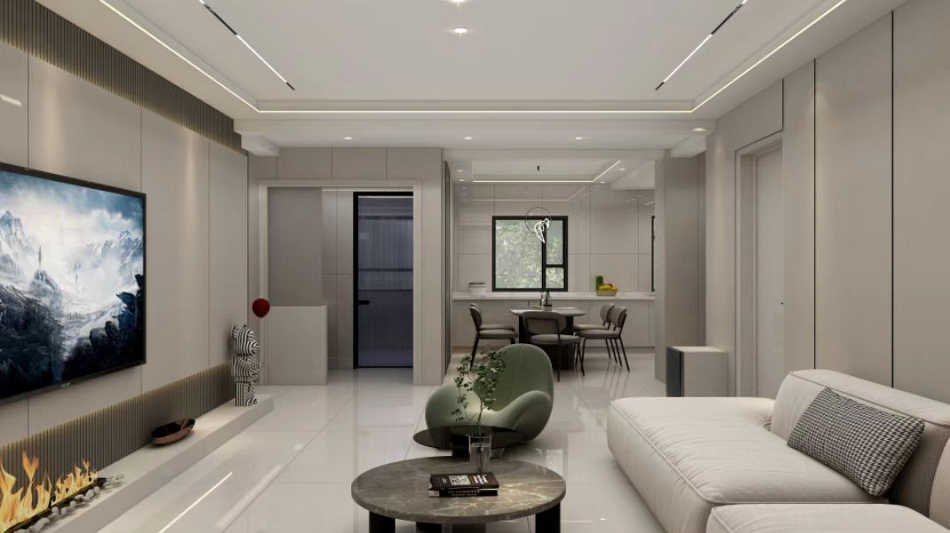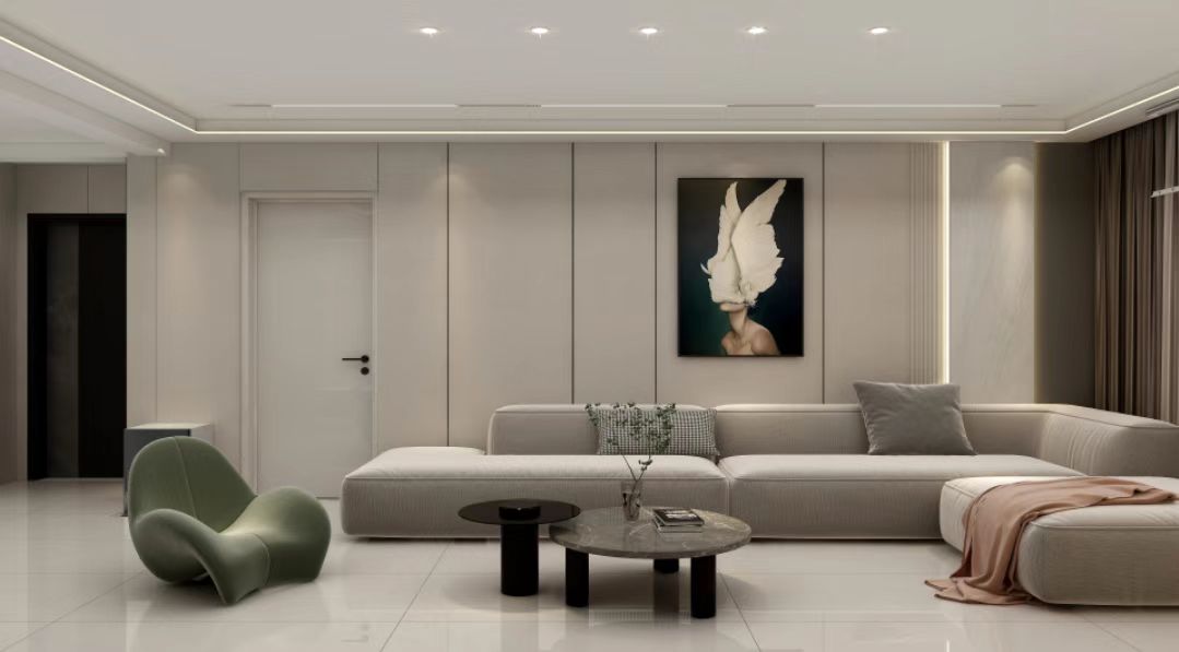 沙發(fā)背景墻同樣采用淺灰色系集成墻板