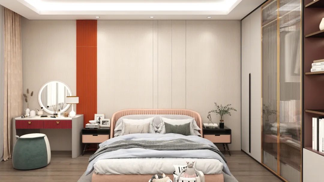 柔和的現(xiàn)代風(fēng)帶著一抹愛馬仕橙的暖調(diào),與客廳空間相互呼應(yīng)的線條設(shè)計(jì)帶著和諧的美感,營造了一個盡顯溫馨治愈的睡意空間。