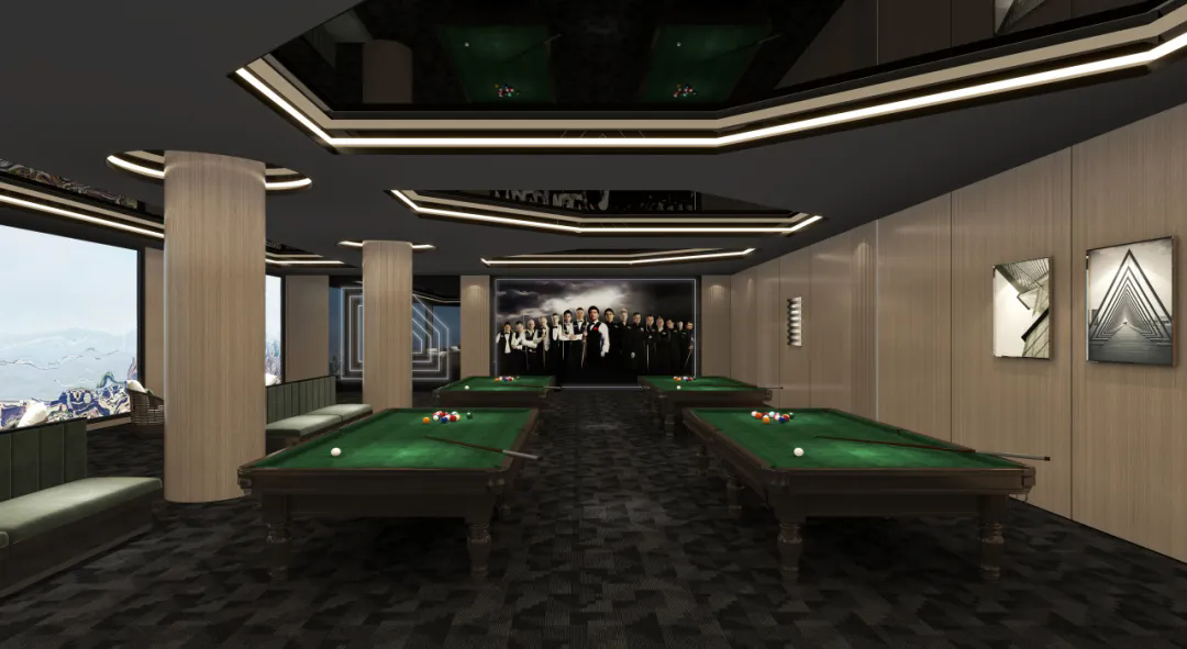 俱樂部劃分為競技區(qū)、休閑區(qū)。競技區(qū)墻面采用豎向燈帶強化空間縱深感;休息區(qū)則以橫向暖光烘托松弛氛圍。