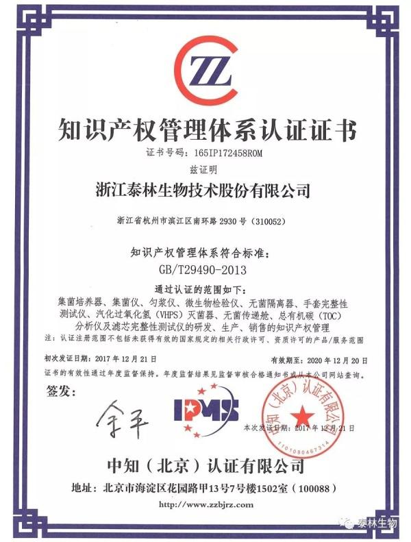 去年6月,泰林生物召開知識產(chǎn)權(quán)貫標啟動大會,經(jīng)過近半年的知識產(chǎn)權(quán)管理體系建設運行,2017年12月21日,泰林生物通過知識產(chǎn)權(quán)管理體系評審,正式獲得知識產(chǎn)權(quán)管理體系認證證書。